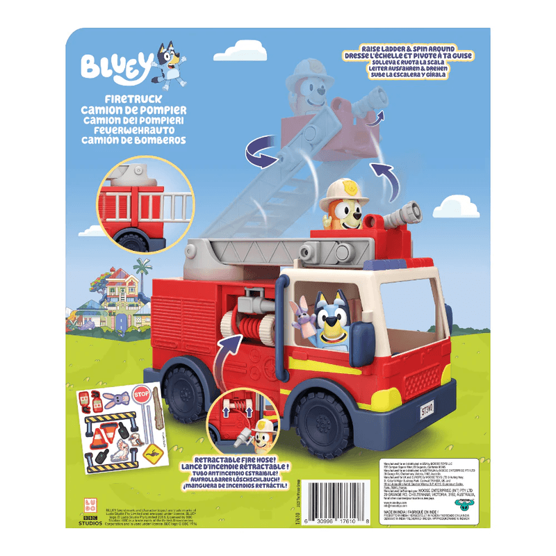 ¡Vive emocionantes aventuras junto a Bluey y su camión de bomberos! El camión de bomberos viene con 2 figuras, Firefighter Bingo y Bluey. ¡Incluso incluye un accesorio de Bob Bilby que cabe en la mano de Bluey! El camión de bomberos tiene el tamaño justo para que Bluey y Bingo puedan sentarse en la cabina del camión y viajar. ¡Levanta la escalera incorporada y girala! ¡Coloca a Bingo encima de la escalera y mueve la manguera de agua para ayudarla a apuntar! Este impresionante camión de también bomberos tiene una manguera retráctil en un lado del camión y una escalera extraíble en el otro que se desliza para jugar más.