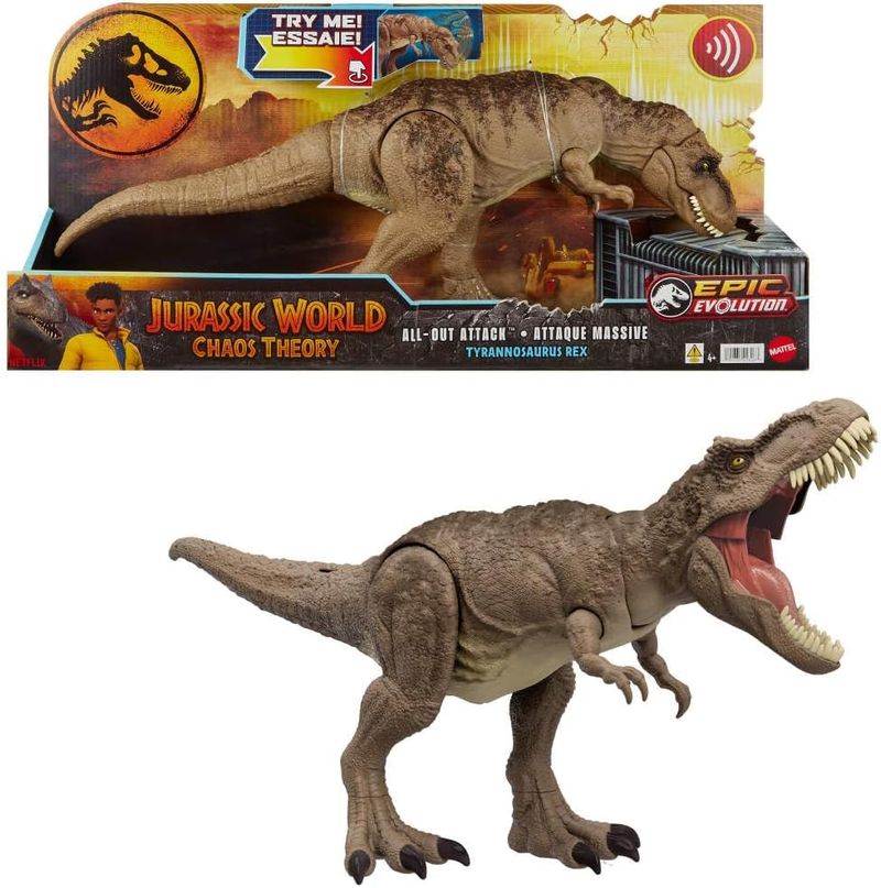 El dinosaurio Ataque Total T. Rex brinda un ataque salvaje y características "evolucionadas para la batalla" a la especie más icónica de todas. El ataque salvaje de esta figura de acción es un espectacular golpe de cuello con movimiento hacia arriba y hacia abajo, junto con una acción de mordida y sonidos de rugido. Entre más rápido se presione el botón, ¡mayores serán los rugidos y las mordidas! Este T. Rex también está "evolucionado para la batalla", ¡con dientes que crecen hasta casi 2 veces su tamaño! Escanea el código de seguimiento oculto en la aplicación gratuita Jurassic World Play con un dispositivo inteligente compatible (Android o iOS, no incluidos) para desbloquear una versión digital del dinosaurio y acceder a juegos ferozmente divertidos. Los colores y las decoraciones pueden variar.