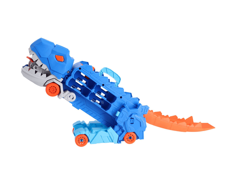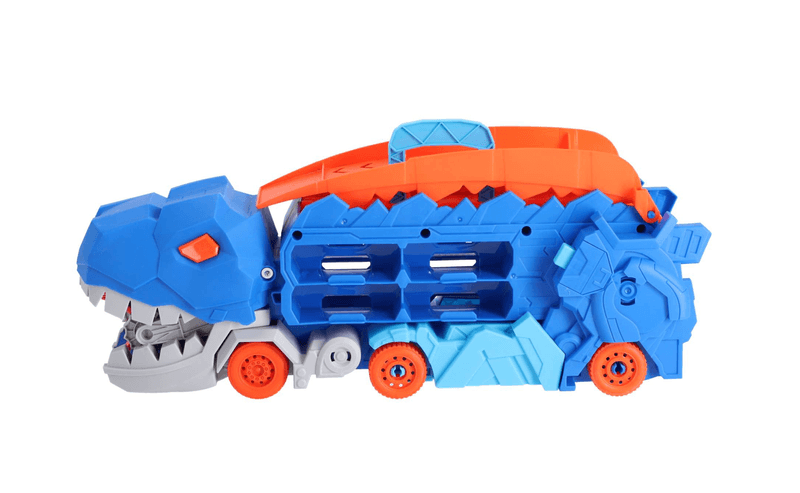 Este juguete de camión para niños hace que sea un gran juego de empuje por sí solo, mientras que también sirve como espacio de almacenamiento para autos pequeños. Y el camión de juguete 3 en 1 para niños también se transforma en una pista de carreras de 61 pulgadas con un lanzador dual para carreras competitivas. este camión de dinosaurios no solo se puede utilizar como un vehículo de transporte push-pull, sino también como un espacio de almacenamiento para autos pequeños. se puede transformar en una pista de doble fila, y coches de carreras en la pista de carreras lado a lado que corre por su espalda. estillo seguro en la parte posterior se abre y se saca para crear una pista de carreras de 61 pulgadas, que es ideal para 1 o 2 jugadores para correr. Simplemente presione un botón y el lanzador empujará automáticamente los autos fundidos a presión en la pista. ¡Compite con tu pareja para ver cuyo coche es más rápido!