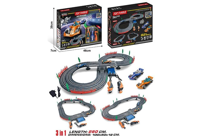 La Top Turbo 3 en 1 es una pista eléctrica de alta velocidad diseñada para los amantes de las carreras. Con 280 cm de longitud total, permite armar 3 circuitos diferentes, ofreciendo variedad, emoción y horas de competencia. Incluye 2 autos de carreras, mandos de control y detalles realistas en toda la pista.