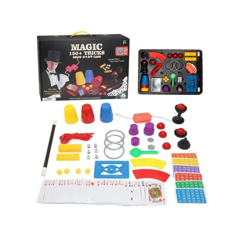 ¡Convierte cualquier momento en un show increíble! Este Set de Magia con más de 150 trucos es perfecto para niños y principiantes que quieren entrar al asombroso mundo del ilusionismo. Incluye baraja de mago, varita mágica y accesorios especiales para realizar trucos con cartas, desapariciones, transformaciones, adivinaciones y mucho más.