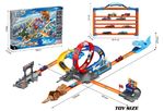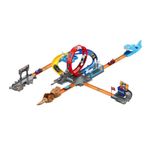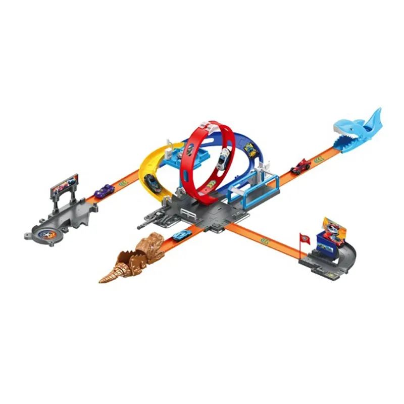 La Track Racing Mega Dino & Shark es una pista gigante llena de acción, velocidad y sorpresas. Incluye un looping doble 360°, un tiburón devorador, un dinosaurio atrapador, zonas de choque y una pista extendida que alcanza más de 130 cm de largo, ideal para los amantes de las acrobacias extremas.